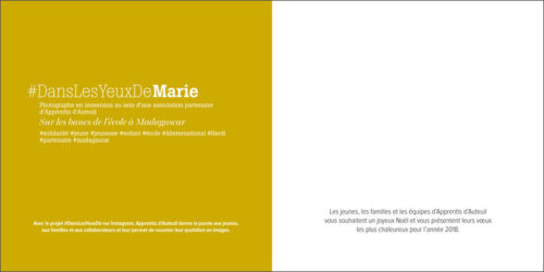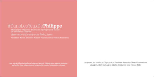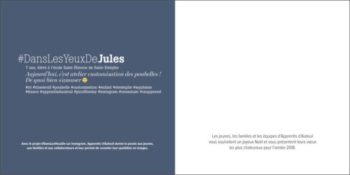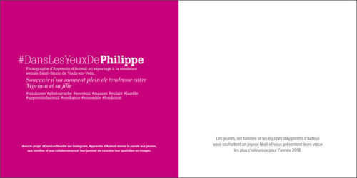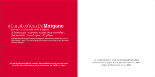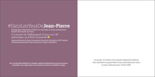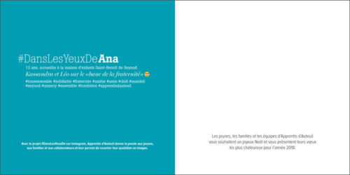 Pour souhaiter cette nouvelle année 2018, Apprentis d’Auteuil a édité plusieurs cartes de vœux en utilisant les images provenant du projet #DansLesYeuxDe sur Instagram. Ce projet donne la parole aux jeunes, aux familles et aux collaborateurs et leur permet de raconter leur quotidien en images.