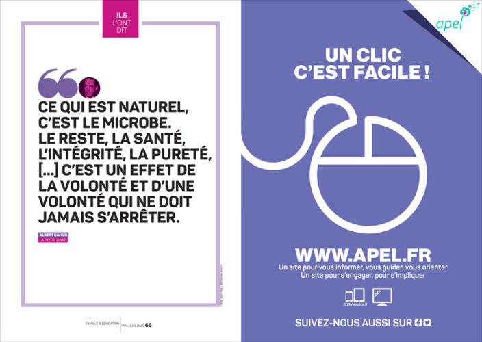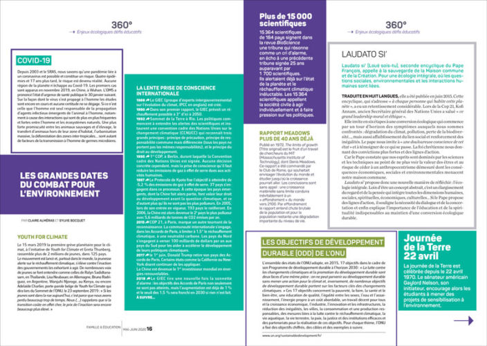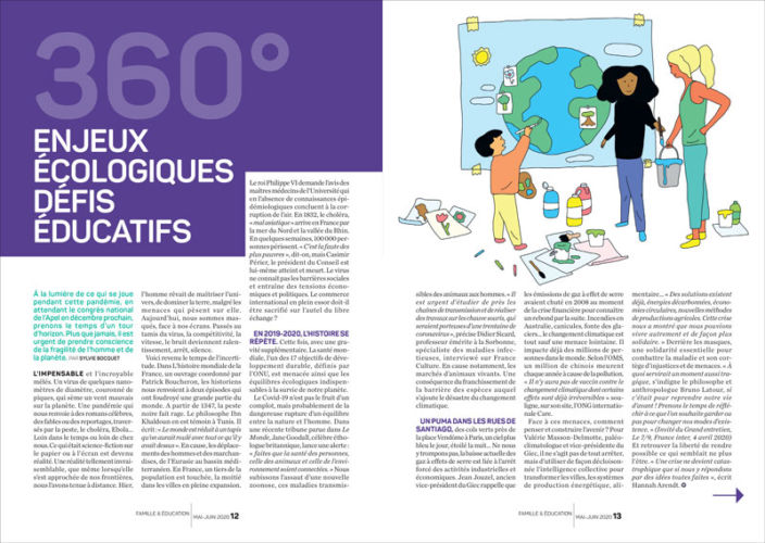 Le dernier numéro de Famille & éducation propose un dossier sur les enjeux écologiques et les défis éducatifs, la crise sanitaire montre combien il est urgent de réconcilier l’homme et la planète. Réalisé pendant la période de confinement les pages scolarité abordent la problématique de la continuité pédagogique et éducative à l’heure du déconfinement.