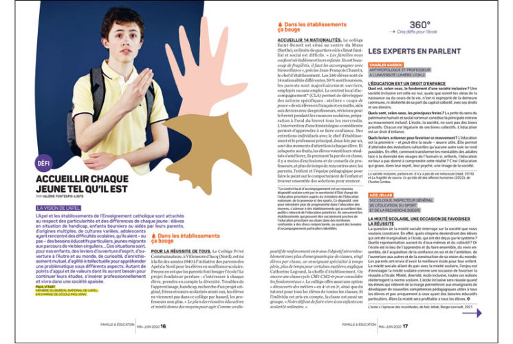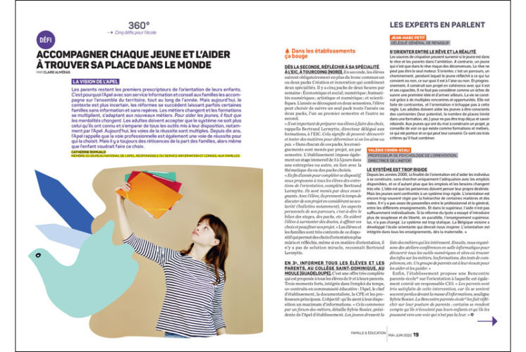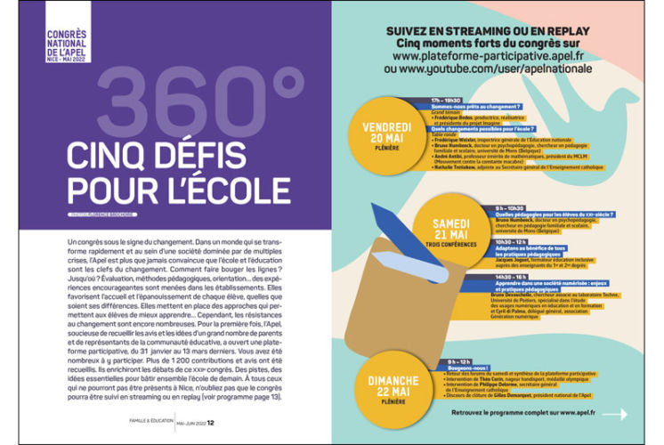 Le dernier numéro de Famille & éducation consacre son dossier aux idées qui permettront de bâtir l’école de demain. Un 360° en lien avec le XXIIe Congrès National de l’Apel, enrichi d’une plateforme participative qui a recueillie plus de 1200 contributions. Metavers, rythme de vie, préparation au grand oral du Bac, nouvelles filières de la santé autant de sujets qui conseillent et orientent la famille.